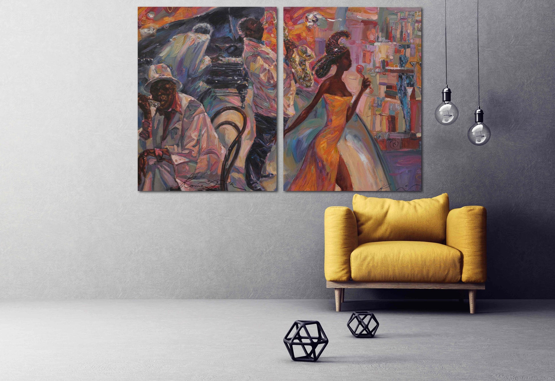 Mehrteiliges Wandbild mit Musikmotiv in verschiedenen Größen, von übergroß bis extragroß. Das Gemälde wird waagefertig geliefert und erfordert keine zusätzliche Anmeldung.